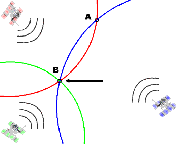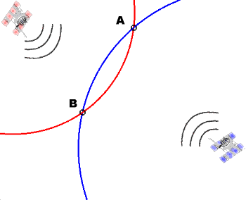 If we have ranges from two satellites, then we draw two circles and see where they intersect. In the example below, the receiver could be at point A or point B.