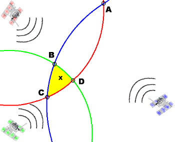 Unless the three pseudo-ranges are exact, the three arcs will not intersect at a common point. The area in yellow on the figure is called the "triangle of error", within which the final solution lies (X). By making small adjustments to its internal clock and applying various error corrections, the GPS receiver tries to minimize the size of this triangle and determine its final position.