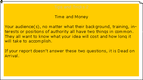 No matter how widely varied your audiences' interests are there are two things everyone of them may be expected to understand. These are time and money. Your report must answer these two basic questions for every reader.