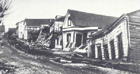 sections. The New Madrid, Missouri, Earthquakes of 1811-1812The most widely felt earthquakes in the history of the Lower 48 States was a series of temblors that occurred in 1811-1812 near New Madrid, Missouri. At 2 am on December 16, 1811 loud noises and the toppling of chimneys awakened the people of New Madrid. Trees crashed to the ground and great fissures tore open the ground. When the frightened inhabitants ran outside, the undulating ground made it difficult for them to stand. It is now believed that this initial earthquake, which had an estimated magnitude of about 8.6, was the first shock of two major earthquakes that occurred on that day. These two events were followed by numerous aftershocks that continued until a third major earthquake, with an estimated magnitude of 8.4, occurred on January 23, 1812. But, after about two weeks of relative calm, another severe shock, with an estimated magnitude of 8.7, struck the same region on February 7, 1812. This last event was followed by sizeable aftershocks that occurred over a period of several days and continued to be felt in decreasingly smaller intensities for over one year. The largest of these quakes was felt from Canada to the Gulf of Mexico and from the Rocky Mountains to the Atlantic Ocean. The course of the lower part of the Mississippi River was altered by these events. The ground motions were so strong that chimneys were toppled in Cincinnati, Ohio, and church bells rang in Boston, Massachusetts. However, because the most intense effects were in a sparsely populated region, the destruction and loss of human life was slight. If these same earthquakes were to occur in the same area today, it would cause severe damage to many cities in the central Mississippi Valley. The Charleston, South Carolina, Earthquake of 1886In the Charleston, South Carolina region, there had been warnings since the beginning of the1886 summer. Several tremors had been felt in the city, but these had attracted little attention at the time. A larger shock had been felt on August 27 at Summerville, about 20 miles north of Charleston. On August 28, at 4:45 p.m. there was another shock at Summerville which was also felt in Charleston, where there was a slight rocking of houses and rattling of windows. However, no one was prepared for what followed on the evening of August 31. Presented below is an eye witness account of what happened as recorded by the curator of the Charleston Museum at the time: “At the hour of 9:50 p.m., there was suddenly heard a rushing roaring sound compared by some to a train of cars at no great distance, by others to a clatter produced by two or more omnibuses moving at a rapid rate over a paved street; by others again to an escape of steam from a boiler. It was followed immediately by a thumping and beating of the earth underneath the houses, which rocked and swayed to and fro. Furniture was violently moved and dashed to the floor, pictures were swung from the walls and, in some cases, completely turned with their backs to the front, and every movable thing was thrown into extraordinary convulsions. It was probably then, during the period of the greatest sway that so many chimneys were broken off at the junction with the roof. The number was afterwards counted and found to be almost 14,000. The duration of this severe shock is thought to have been from 35 to 40 seconds.” The San Francisco, California, Earthquake of 1906The most famous and destructive earthquake of the 20th century in North America was the April 18, 1906 San Francisco event. At 5:12 a.m., local time, a foreshock occurred with sufficient force to be felt widely throughout the San Francisco Bay area. The great earthquake, with an epicenter near San Francisco, shook the area some 20 to 25 seconds later. Violent shocks punctuated the strong shaking which lasted some 45 to 60 seconds. In the public's mind, this earthquake is most remembered for the fire it ignited in San Francisco. The deaths by the destruction and fire that left the city in ruins were initially estimated at 700 people. However, it is now believed that the total loss of life was underestimated by a factor of 3 or 4. Most of the fatalities occurred in San Francisco. The earthquake was felt from southern Oregon to south of Los Angeles and inland as far as central Nevada. Charles Richter in 1958 estimated an initial magnitude of 8.3 for this earthquake. It is now believed, however, that a magnitude of 7.7 to 7.9 is a better estimate. Today,