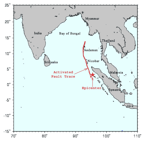 Southeast Asia earthquake of 2004. The red line represents the extent