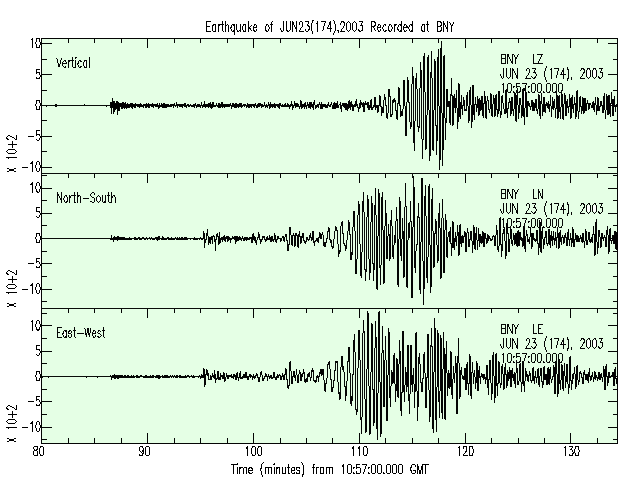 Figure 3: Seismograms of an Alaskan magnitude 6.9 earthquake which occurred on Monday Jun 23 12:12:35 2003 UTC (Universal Time) at: latitude 51.58N, longitude 176.67E, Depth 30km, as recorded by the Binghamton Seismic station, New York.