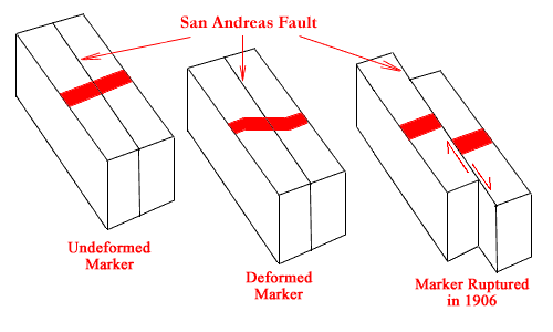 Fault (left), is slowly distorted over a period of time (center). In