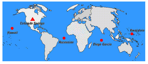 The U.S. Military operates the control segment. There are five control stations around the world, four unmanned stations near the equator and one Master Control Station in Colorado, as shown on the following figure.