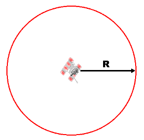Figure 5: In a two-dimensional world, if we have one satellite and a range "R", the receiver could be anywhere on the red circle. (In a 3-D, world, this would be a sphere of radius "R", centered on the satellite.)