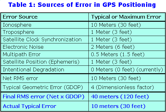 As described earlier in this course, the accuracy of satellite position is about 1 meter (3 feet). This uncertainty in position can introduce errors of similar magnitude in the final position calculation.