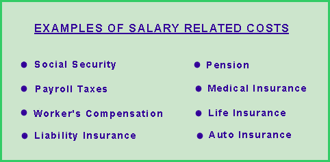 Salary related costs comprise the benefit package offered by the company to its employees. Actual salary related costs for the billable staff is calculated as a percent amount of the annual salary and added to the calculated regular time cost. Some of these costs are government mandated while others are discretionary. Examples of such costs are listed in the following figure: